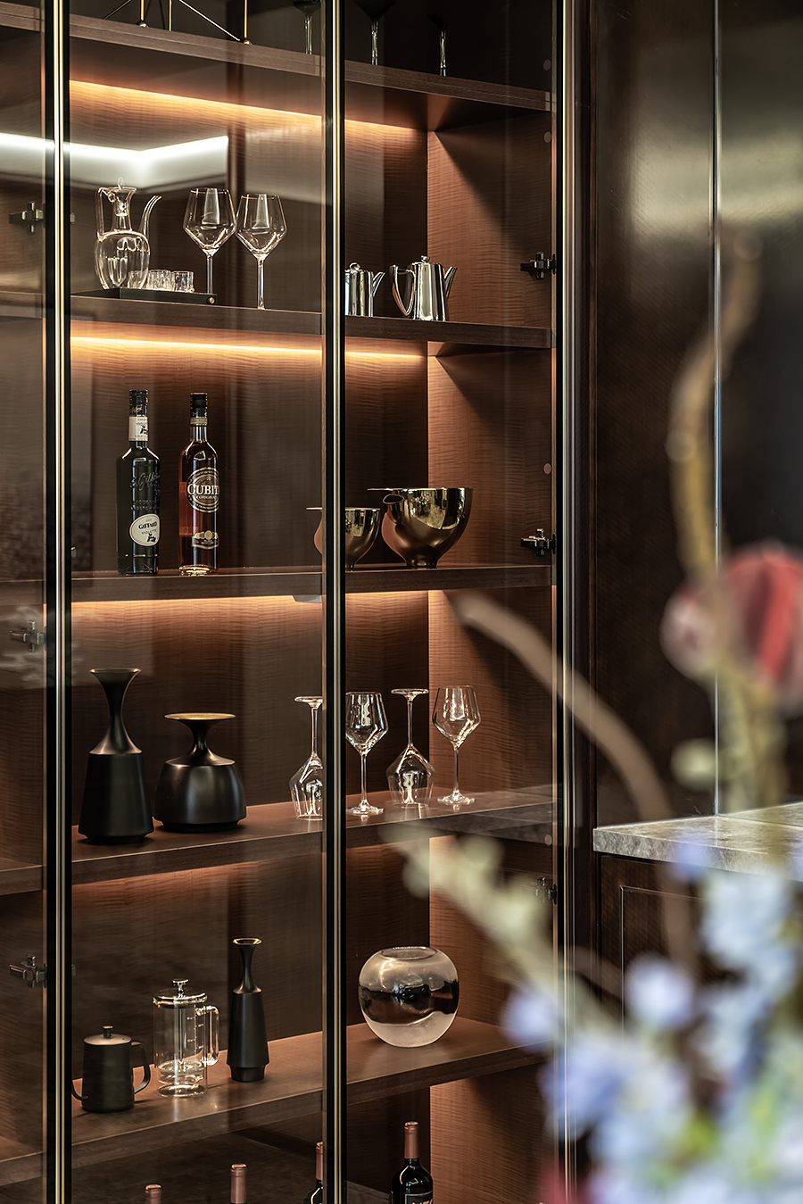 当空间比较小时,一柜到顶既美观又能有效利用空间,而且酒柜收纳功能和方式也非常多样化。